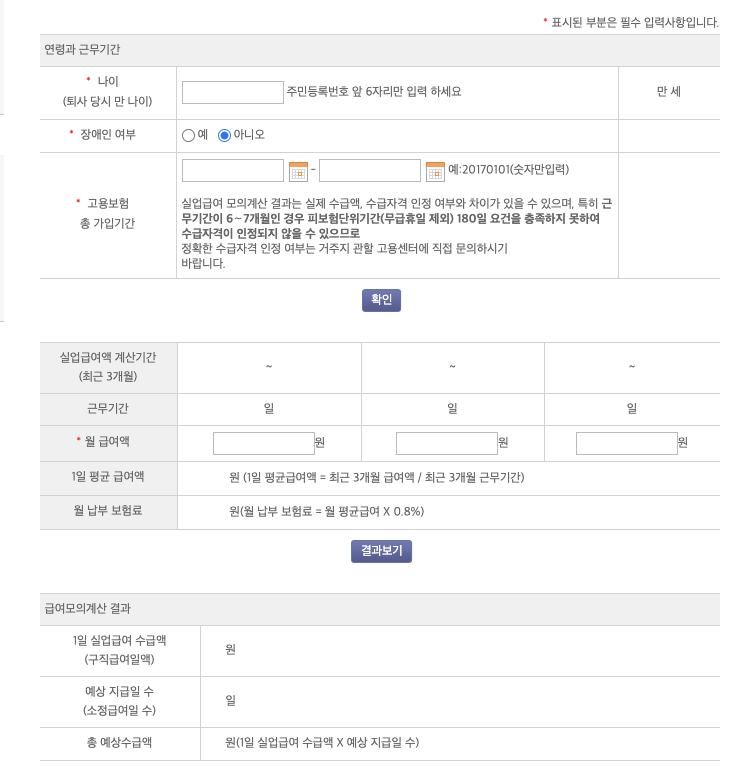 나이, 장애 여부, 출근한 기간, 월급 금액을 입력하면 실업급여 예상 기간과, 얼마나 실업급여를 받을 수 있는지 확인할 수 있다.