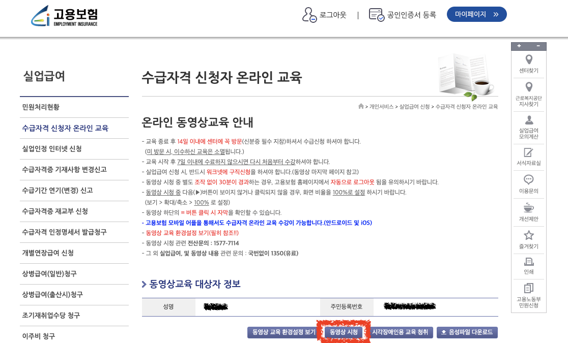고용보험 홈페이지(www.ei.go.kr) → 화면 좌측 바로가기 서비스 [수급자격 신청자 온라인 교육] 클릭 → 본인인증 → 동영상 시청"