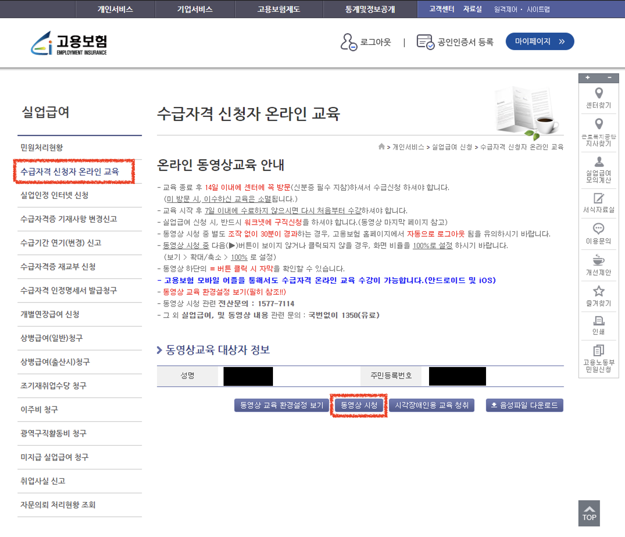 직접 내방해서 교육을받는 것이 아니기 때문에 온라인 동영상 시청을 해야 한다.