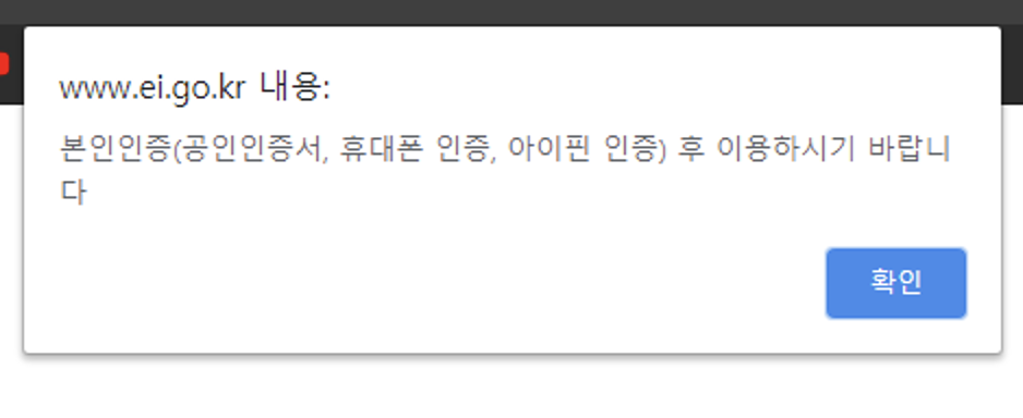 수급자격 온라인 교육 버튼을 클릭하면 본인인증(공인인증서, 휴대폰 인증, 아이핀 인증) 후 이용하라고 얼럿창이 나온다.