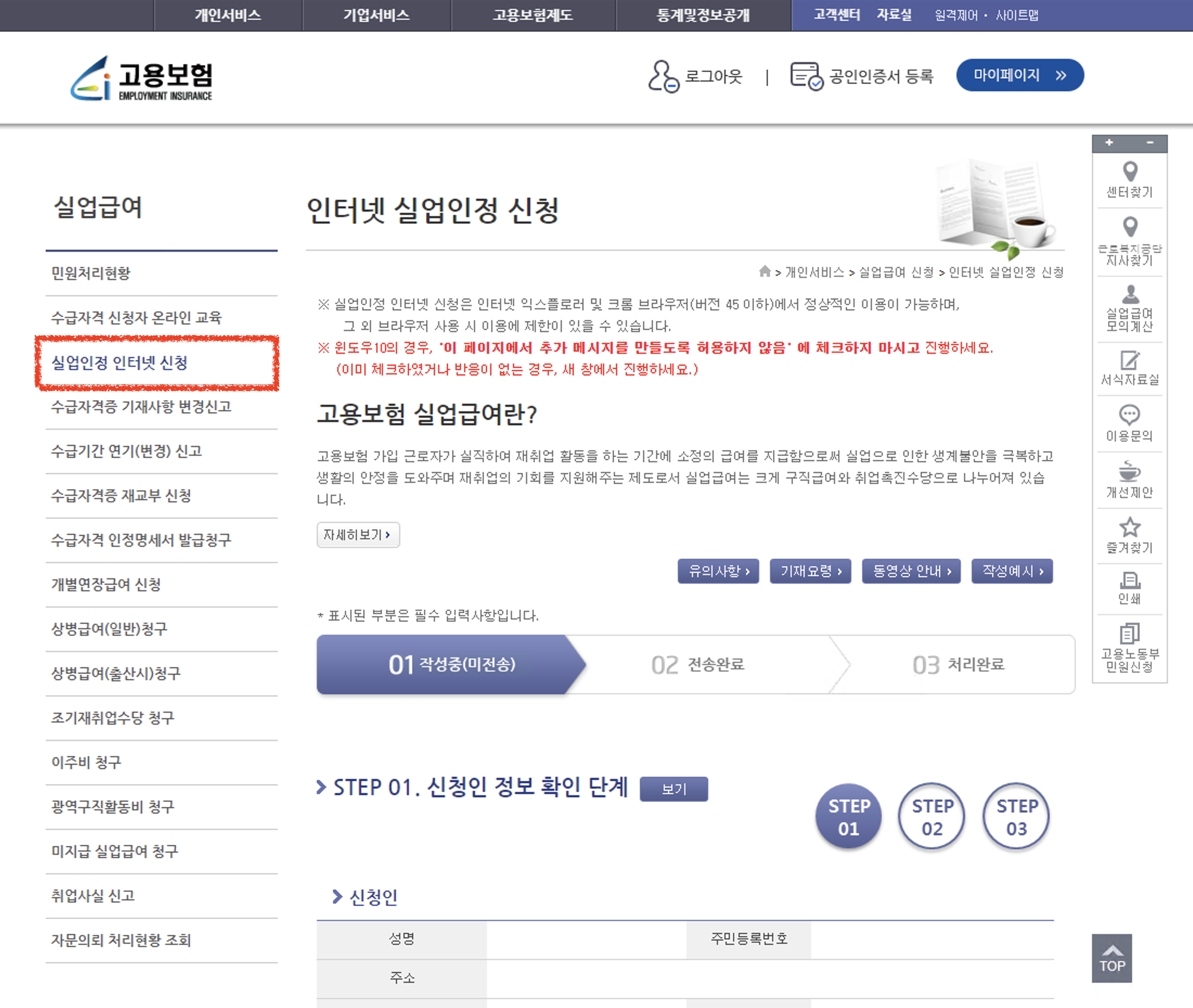 실업인정 인터넷 신청을 누른 뒤 아래 항목을 입력하면 된다.